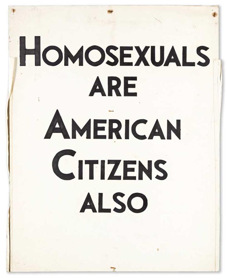 The first is a rare historical document: An ink-on-cardboard placard with the words “Homosexuals Are American Citizens Also” (estimated at $4,000 to $6,000). The poster is believed to be from the Annual Reminders, a series of marches that took place between 1965 and 1969 in Philadelphia.