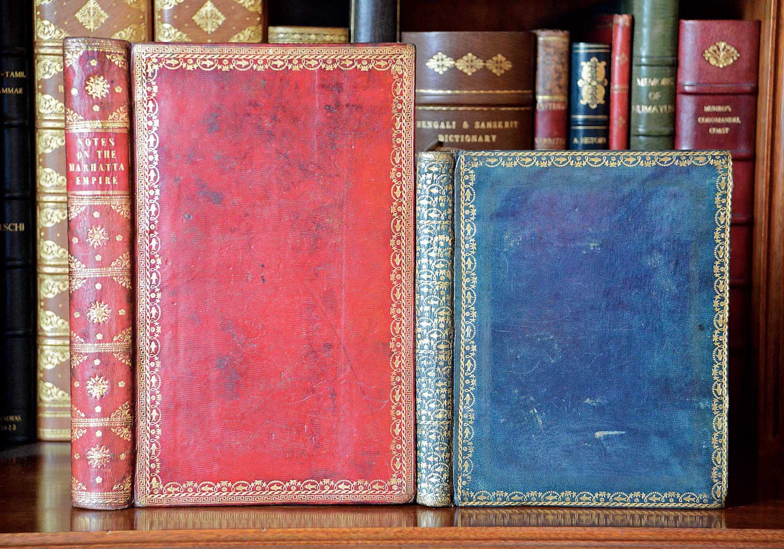 One day he came across a truly astonishing volume: a Calcutta imprint from 1794 in mint condition, bound in a lustrous indigo-blue Indian goatskin binding, with gilt roll tooling around the covers and the entirety of the flat spine consisting of repeated fish and flowers. It was stunning and clearly contemporary with the book’s printing. “I dubbed this unknown binding maestro the ‘Moghul Fish’ binder, as his fish reminded me of the royal insignia used by the rulers of Oude. Years later I found other books bound by the Moghul Fish binder in the same style and books with copies of his distinctive roll tool used on Indian bindings in a more European style.”