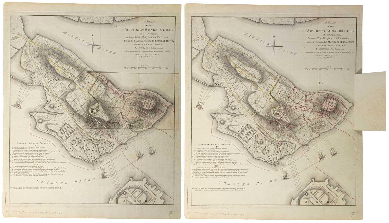 illustration 1: Sir Thomas Hyde Page (1746–1821), A Plan of the Action at Bunkers Hill on the 17th of June 1775, London: publisher unknown, after 1775. Flap: Hand-colored, engraved map with a troop formation overlay.