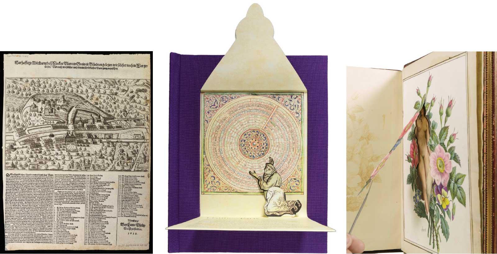 Illustration 2 (left): Johann Philipp Walch (active ca. 1619), Warhafftige Abbildung desz Flecken Plurs…(Truthful illustration [of the shocking destruction] of Plurs…), Nuremberg: J. P. Walch, 1619. Flap: Etched broadside, flap missing. Illustration 3 (middle): Robert Sabuda (b. 1965); after Matthew Paris (ca. 1250), Chronica Majora (Major Chronicle), in Celebration of Pop-Up and Movable Books, New Brunswick, NJ: Movable Book Society, 2004. Dial and Pop-Up: Book with reproduction of the oldest volvelle extant and author portrait. Illustration 4 (right): Guillaume de Lorris (active thirteenth century), author; Octave Delpierre (1802–1879), compiler, Cy est le Rommant de la Rose, ou Tout l’Art d’Amour est Enclose (Here is the “Roman de la Rose,” in which all the art of love is enclosed), London, 1848. Flaps: Manuscript copy of British Library Harley MS 4425 with two added, amateur erotic images under flaps.