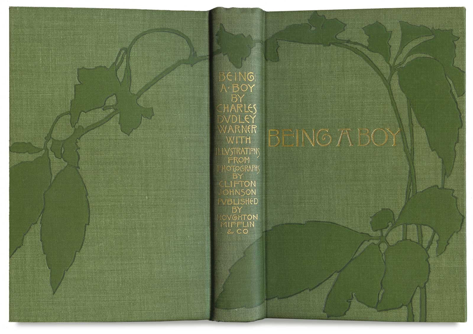 Whitman’s design for Charles Dudley Warner’s Being a Boy (1897), with its dark green leaves wrapped around both covers, has been called the best Art Nouveau trade binding ever produced in America.