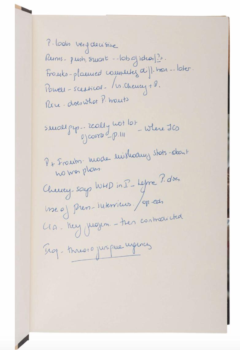 * a first edition of Bob Woodward's 2004 Plan of Attack, with Albright's annotations featuring remarks regarding key individuals involved in the 2003 invasion of Iraq including Colin Powell, Condoleezza Rice, Dick Cheney, and George W. Bush. Estimate: $300 - $400