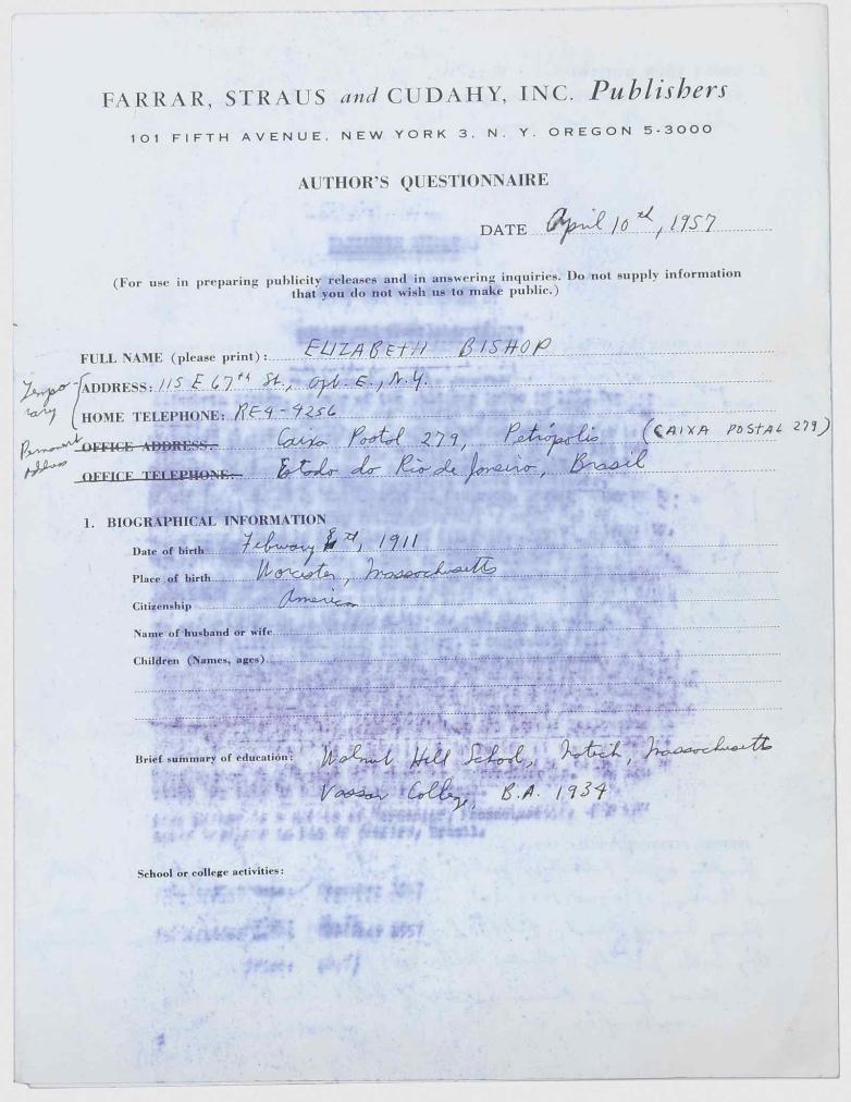 On display from Peter Harrington will be a unique questionnaire, sent to Elizabeth Bishop by her publishers and filled out by her in advance of the publication of The Diary of “Helena Morley”, her first prose work, a translation of Alice Brant’s Minha vida de menina.