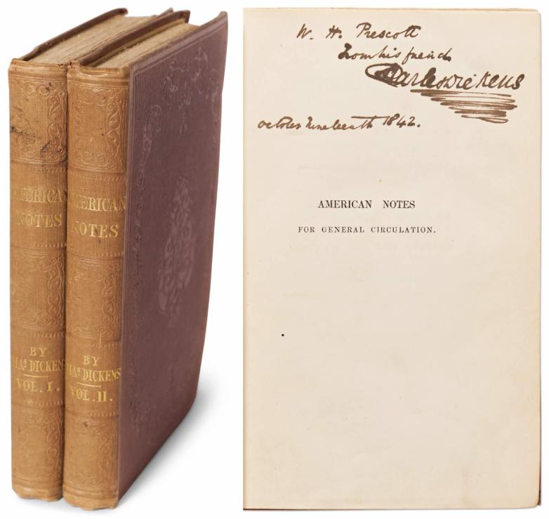Dickens inscribed the book to his close American friend William Hickling Prescott the day after the London publication by Chapman and Hall  in 1842. Issued in two volumes, Dickens signed the half-title of Vol. I, "W. H. Prescott / From his friend / Charles Dickens / October Nineteenth 1842." It is bound in the publisher's original binding of brown-mauve cloth, blind-stamped with gilt titling, and with six pages of advertisements at the end of volume II, as well as pale yellow endpapers.