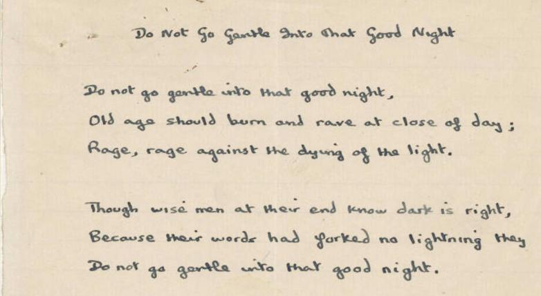 Detail from the first of a nine-page manuscript of “Do Not Go Gentle Into That Good Night” written by Dylan Thomas, undated.