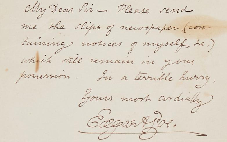 A letter written by Edgar Allan Poe (1809-1849) was the sale’s top lot