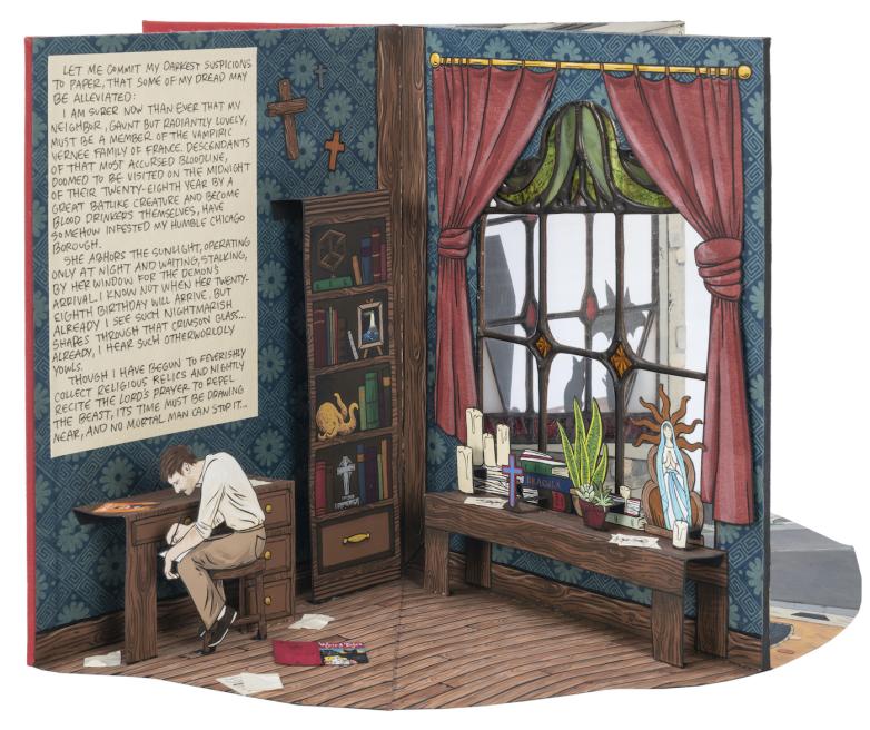 Earlier this year, book artist and illustrator Hannah Batsel made this extraordinary, hand-painted carousel pop-up book and titled it Weirder Than Fiction, an homage to the sci-fi/fantasy magazine Weird Tales. Opening it reveals a diorama of two Chicago apartments, separated by a stained-glass window, where two bookish protagonists “have grown suspicious of each other”—the man is reading The Brotherhood of Blood by Hugh Cave (Weird Tales, May 1932) and the woman is reading H.P. Lovecraft's The Call of Cthulhu (Weird Tales, February 1928).