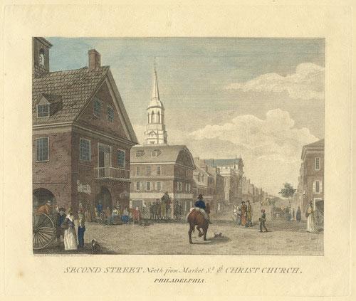 William Birch, Second Street North from Market St. w[i]th Christ Church, (Philadelphia, W. Birch),1827-1828. Hand-colored engraving.