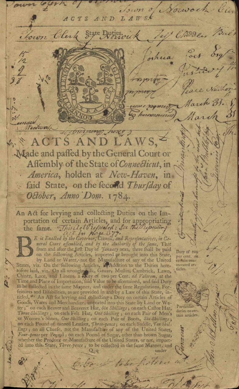 The 1784 Acts of the Connecticut Assembly, covered with the signatures of town clerks, doodles, and pen trials.
