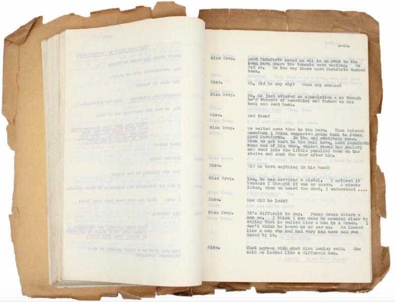 c 1934.  approx. pp. 100, typed on the recto only, with underlining in red. Stitched wraps with text typed on the front cover (including title and author name, as well as "4th copy" and the name and address of Christie's agent, L. E. Berman. The Dead Harlequin was first published in the March 1929 issue of Grand Magazine.  The unpublished play offered here (which has a scene set at the Mayfair Galleries in June 1934), changes the setting and the characters, and twists and expands and contracts the earlier short story into a remarkably different performance.