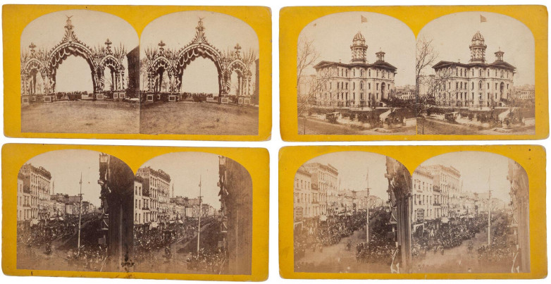 Four stereoview images of Abraham Lincoln's funeral procession in Chicago, part of a group of seven offered at Freeman's | Hindman on July 2.