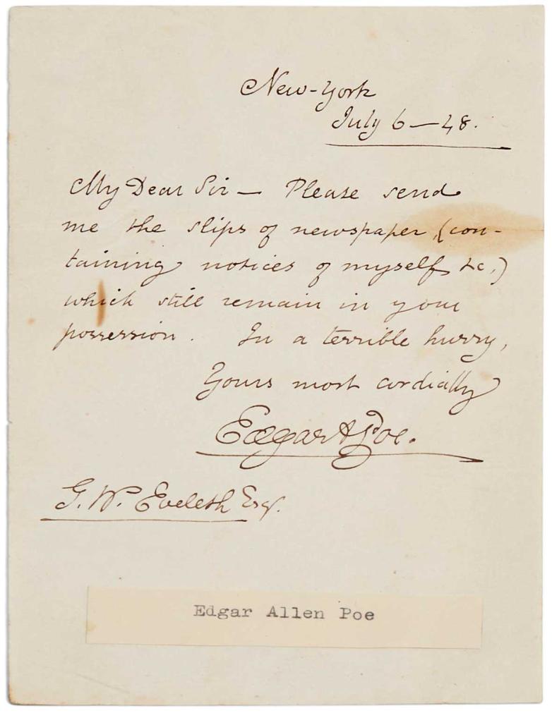 An 1848 Edgar Allan Poe letter, offered at Bonhams Skinner this week.