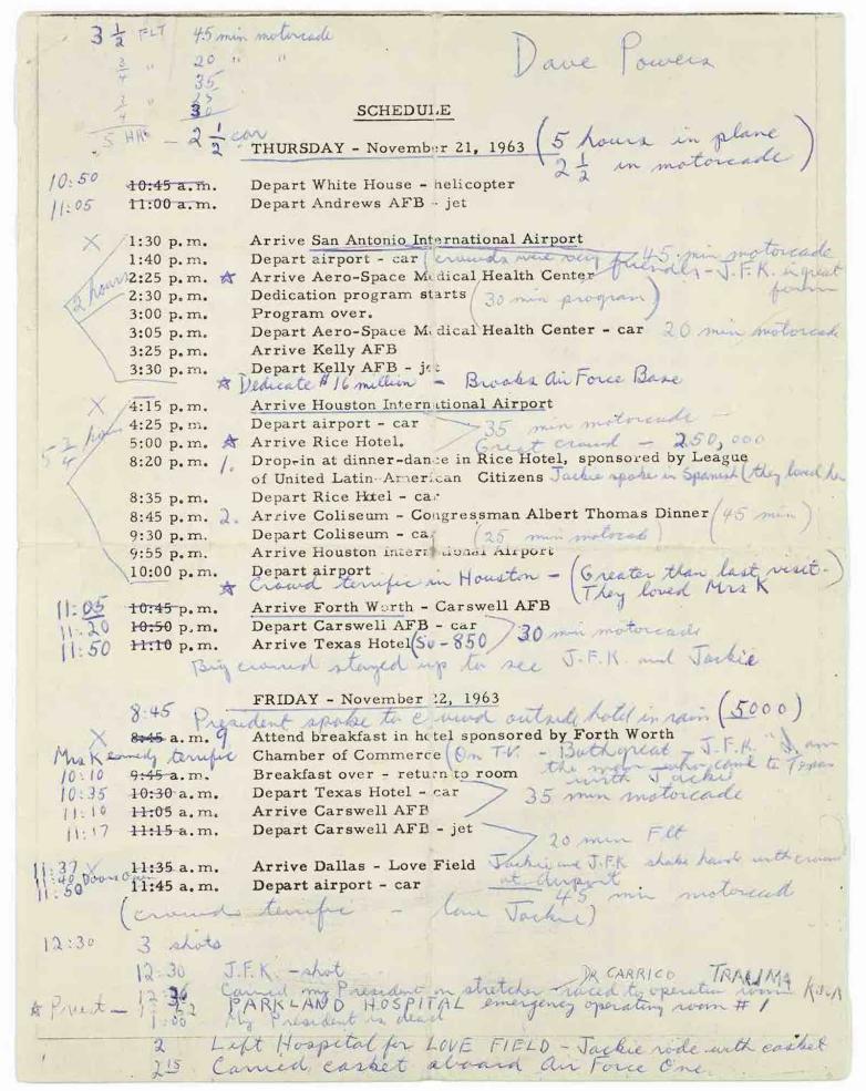 * President Kennedy's last day official schedule annotated by with minute-by-minute detail (estimate: $40,000 – $60,000)