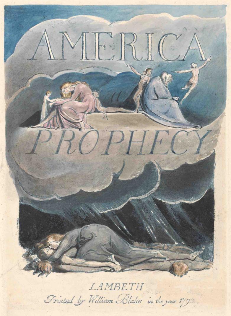 Plate 2 from America a Prophecy, Copy M, printed about 1807 William Blake. Relief etching printed in blue with pen and ink and watercolor. Yale Center for British Art, New Haven Paul Mellon Collection.