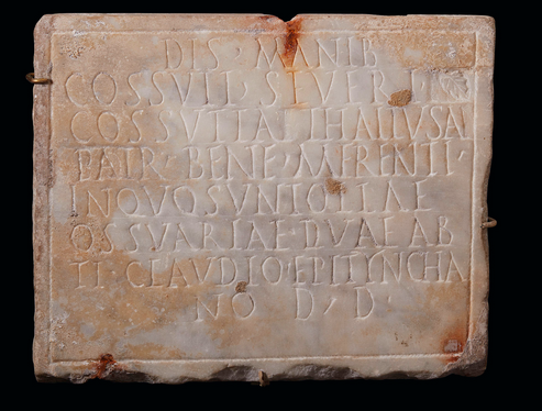 Consigned by Massachusetts-based collector Victor Gulotta, the nearly twelve-inch-wide marble slab is inscribed on both sides. The front reads, in Latin, “Faustina (set this up) for Restuta and herself.” On the reverse is etched ‘To the Spirits of the Dead of Cossutius Severus, Cossutia Thallusa, to her well-deserving patron (set up this monument), in which there are two vessels for bones, given as a give by Tiberius Claudius Epitynchius.” However, one of those benefactors wasn’t quite as dead as the inscription suggested. According to a recent paper published in the German-language Journal of Papyrology and Epigraphy, scholar Ricardo Bertolazzi says that each face of this unusual double-sided stone was inscribed perhaps two centuries apart, and that one of the inscriptions reveals a stonecutter’s error and attempts at correcting it. Bertloazzi points to scratches the stonecutter made to wipe out the offending Latin suggesting that the lady Thallusa was already deceased. The errant endings were “erased” as best as possible, but left behind tell-tale marks that mar an otherwise stately stone.