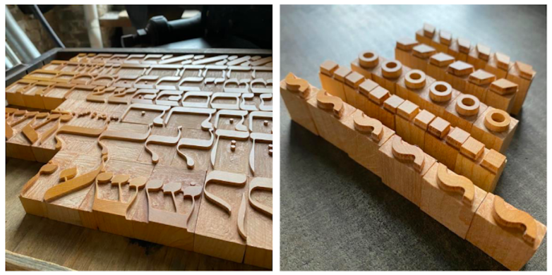 Funded by a Minnesota State Arts Board grant in 2019, the wood type was manufactured at Hamilton Wood Type and Printing Museum in Two Rivers, Wisconsin this year. Skilled second and third generation type cutters used a pantograph machine to fashion the letters from blocks of maple. This will be the first time in Hamilton’s history that the type cutters tackle Arabic type.