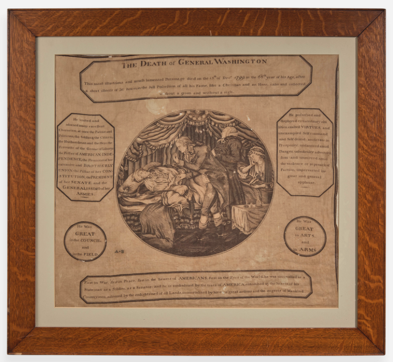 Printed memorial handkerchief on cotton depicting the death of George Washington, offered at Freeman's this week.
