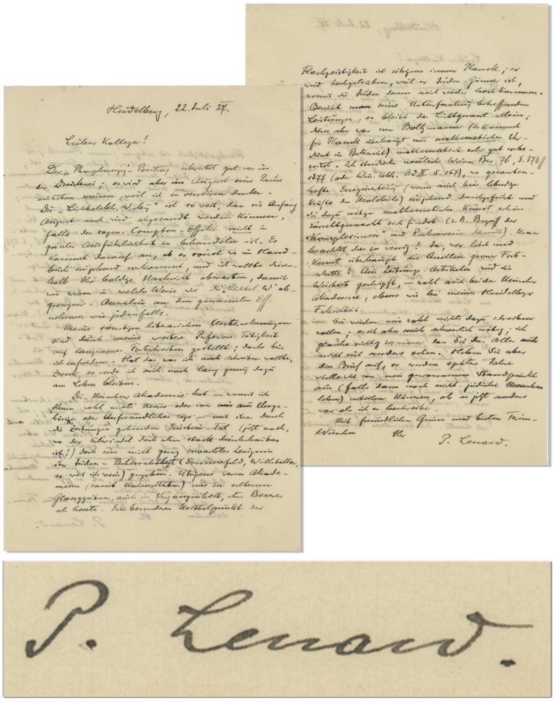 Lenard provided content on both his scientific work, and his rival Albert Einstein, who Lenard often dismissed as the leader of ''Jewish Physics.'' The letter was dated July 22, 1927 from Heidelberg, Germany. Lenard wrote to fellow Nobel Prize winning physicist Wilhelm Wien, who he believed shared his anti-Semitic views.