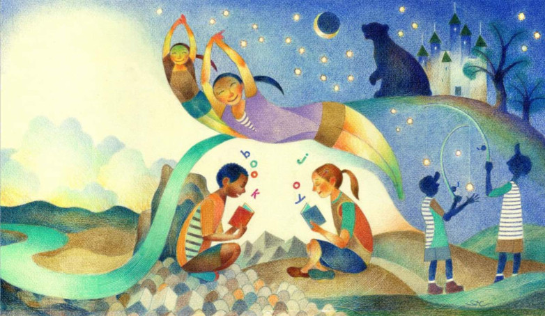 Raúl Colón, “We can read, you and I, see letters become words and words become books we hold in our hands.” Bookjoy, Wordjoy, 2018. Author: Pat Mora. Final illustration, as published. Watercolor, colored pencils, and lithograph pencils on watercolor paper.