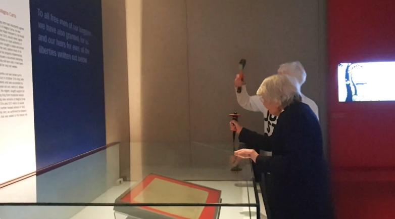 Two campaigners from British environmental activist group Just Stop Oil today took a hammer to the glass protecting the copy of the Magna Carta in the British Library's Treasures Gallery in London.