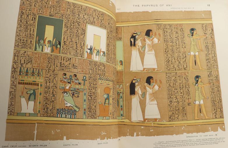 From Evening Star Books, an Egyptian set: Budge, E.A. Wallis. The Book of the Dead: The Papyrus of Ani in the British Museum; Book of the Dead: Facsimile of the Papyrus of Ani in the British Museum The Egyptian Text with Interlinear Transliteration and Translation, a Running Translation, Introduction, Etc.; Printed by the Order of the Trustees. London: Sold at the British Museum; and by Longmans & Co. ... and Henry Frowde, 1895; 1894. First edition; Second Edition. The text volume is illustrated with the hieroglyphs throughout. The plate volume is illustrated with 37 chromolithographs, bright and beautiful, showing the images of the Papyrus of Ani. The text volume is the first edition of Budge's Book of the Dead (the Papyrus of Ani portion), and was issued as a companion to the second edition of the facsimile of the Papyrus of Ani (known as the plate volume). The facsimile of the Papyrus of Ani was first issued in 1893. This set is extraordinarily difficult to find together, and in collectible condition. A fascinating work of classical scholarship, one that made ancient Egyptian religious traditions accessible to English scholars and readers. Price: $2,500