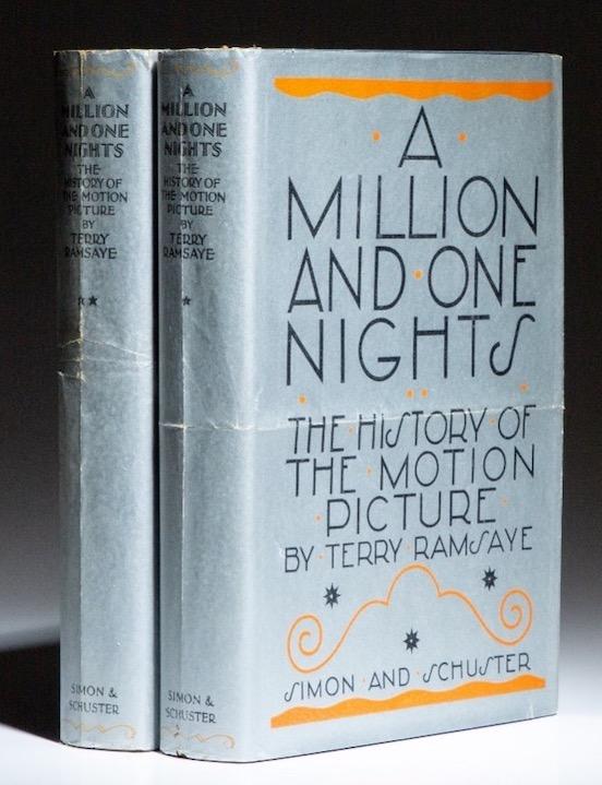 From The First Edition Rare Books, a classic of film history: A first edition of A Million and One Nights: A History of the Motion Picture by Terry Ramsaye, two volumes with scarce dust jackets. New York: Simon and Schuster, 1926. Octavo, [2 volumes], lxx, [2], 400pp; 401-868pp. Blue cloth, title stamped in gilt on spines with decorative gilt image on front covers. Date on title and copyright pages is the same with no additional printings mentioned. Top edges gilt, untrimmed fore edges. Both volumes have frontispiece portraits with tissue covers and all illustrative plates are present. Bindings are solid, and the text of both volumes is clean. Price: $1,500