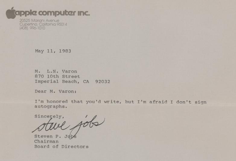 Also on Thursday, Apple and Steve Jobs at RR Auction, in 35 lots. A working Apple-1 computer from the collection of Roger Wagner is expected to lead the sale, estimated at more than $450,000. An amusing May 11, 1983 note from Steve Jobs replying to a request for an autograph by writing "I'm honored that you'd write but I'm afraid I don't sign autographs," and then signing the typed letter, is estimated at more than $10,000 but had been bid up to more than $35,000 as of Sunday afternoon. An Apple Lisa model, also from Roger Wagner's collection, is expected to fetch more than $25,000. The first issue of Macworld magazine, signed on the cover by both Jobs and Wozniak, is estimated at more than $50,000.