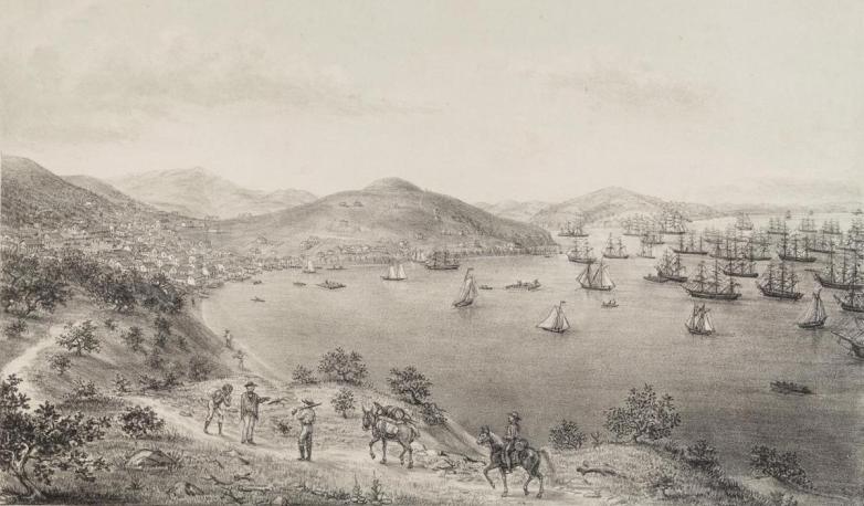 A lithograph of George H. Baker's drawing of San Francisco harbor on June 1, 1849 is offered at PBA Galleries this week.