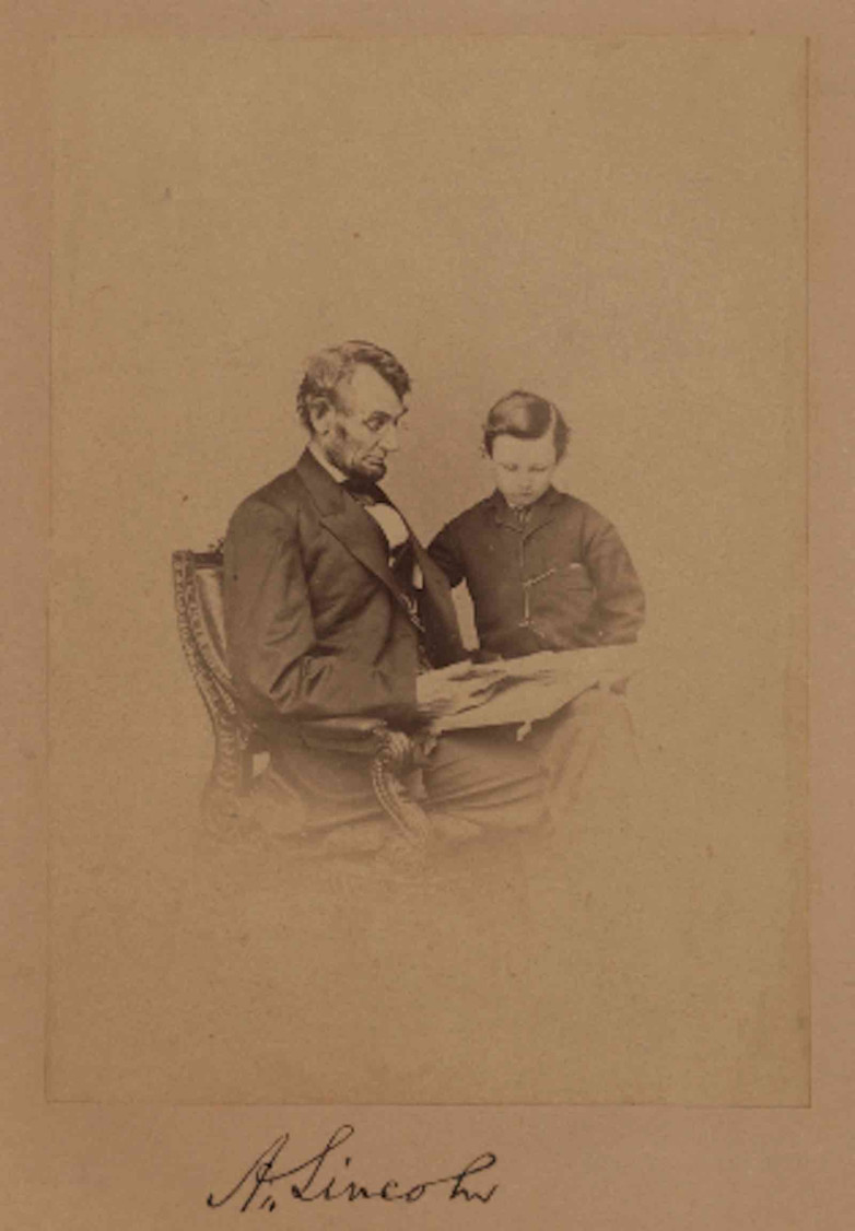 Original portrait photograph of Lincoln seated with a book and his son Tad, taken February 9, 1864