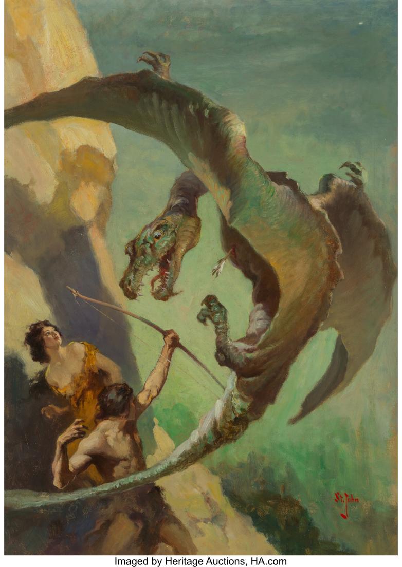 James Allen St. John At the Earth's Core book dust jacket, 1922 (estimate: $75,000+) is a spectacular image that was published on the hard cover dust jacket of the first edition of At the Earth’s Core by Edgar Rice Burroughs (A.C. McClurg & Co., 1922). St. John is widely recognized for his impact on the visual language of fantasy illustration, in part because of the image offered here. To land such an iconic image from such an important book by an artist considered one of the best ever at fantasy illustration presents a rare opportunity for serious collectors.