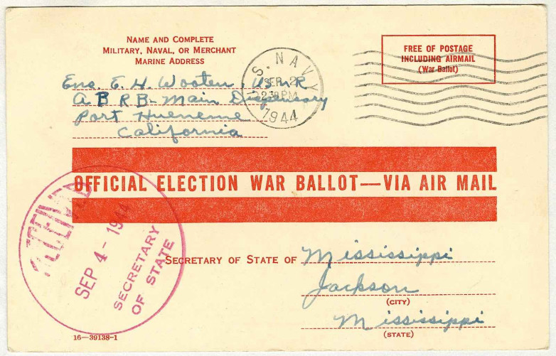 • World War II absentee voting materials developed for U.S. Armed Forces, including the design of a blank ballot allowed the government to distribute them before specific candidate names became available, thus accommodating weeks-long mailing time for U.S. forces overseas