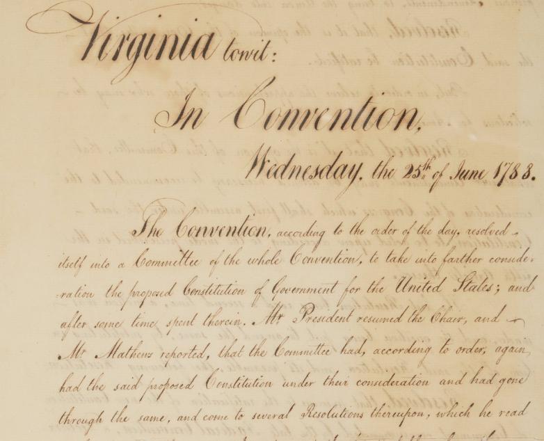 Signed in June 1788, the manuscript placed the fledgling United States on a sure and secure footing, and represents the official record of the final, critical days of The Virginia Ratification Convention—also known as the Virginia Federal Convention. The Convention was called in response to the recommendation of the Philadelphia Convention that the proposed Constitution be submitted to a Convention of Delegates for their assent and ratification. The Philadelphia Convention had decreed that Constitution would become the supreme law of the United States after approval by only nine of the thirteen states. Ten days before the Virginia Convention first convened, eight other states had ratified the Constitution, making the timing of the Virginia’s deliberation especially critical.