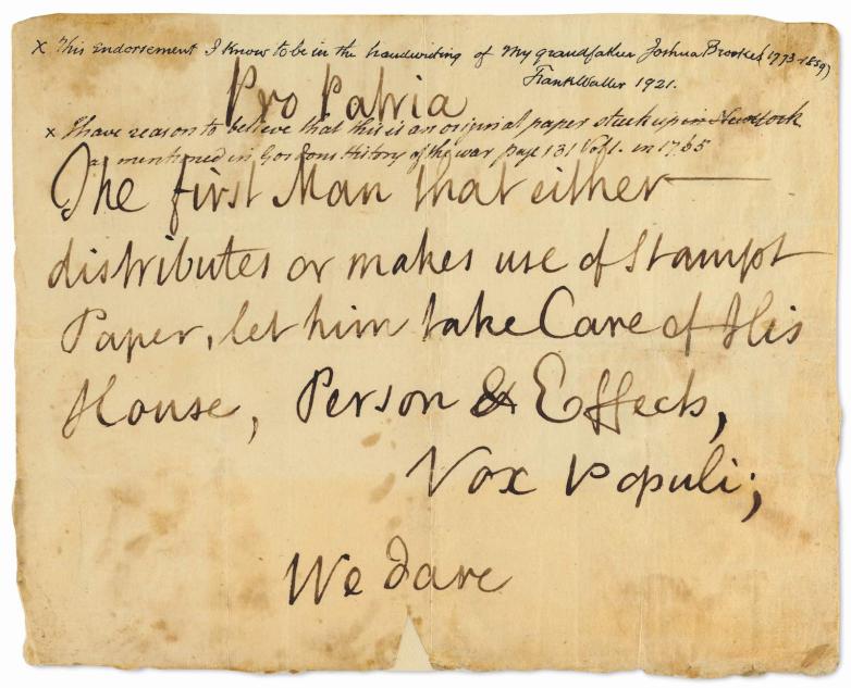 STAMP ACT CRISIS [THE SONS OF LIBERTY – LAMB, John (?) (1735 ‐1800).] Autograph document signed (“Vox Populi”), [New York, October 23‐24 , 1765]. One page, 156 x 192mm., on laid paper. Estimate: $4,000,000-6,000,000