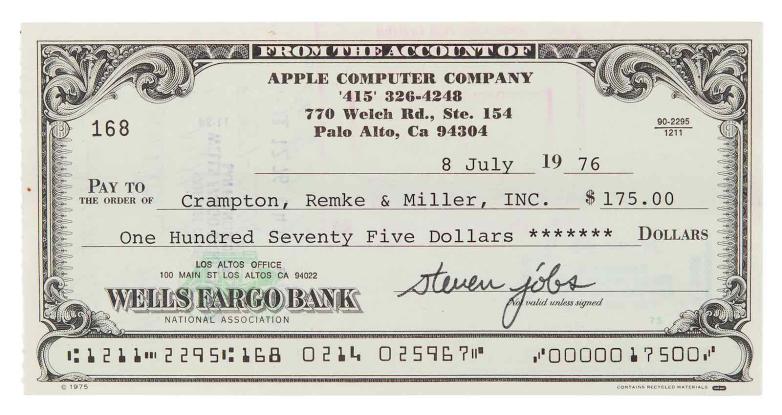 The check, measuring 6 x 3 inches, is filled out in type and signed by Steve Jobs, payable to Crampton, Remke & Miller, Inc. for $175, dated July 8, 1976. This check is significant not only for its association with the co-founder of Apple, but also for the fact that it uses the company's first official address at 770 Welch Rd., Ste. 154, Palo Alto. This address was that of an answering service and mail drop that they used while still operating out of the Jobs family garage.