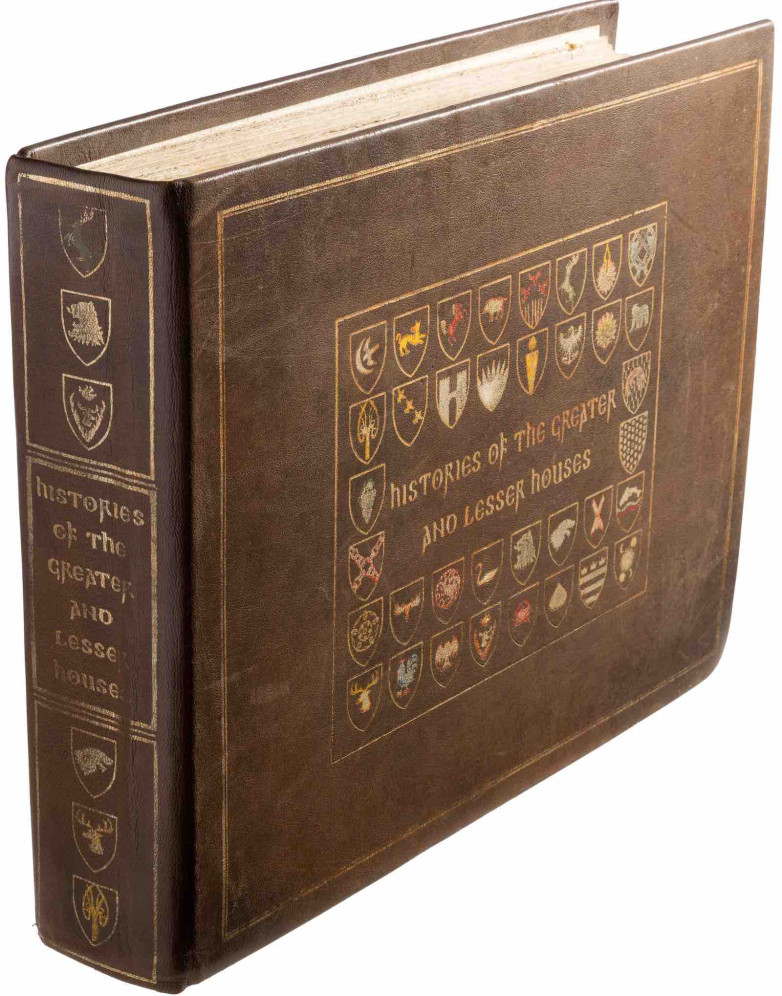 The brown leather-bound Histories of the Greater and Lesser Houses prop appeared in episode six of season two of the HBO adaption of George R. R. Martin's A Song of Ice and Fire sequence. It includes some text on eight pages of translucent parchment paper featuring gold calligraphy and colorful artwork between hundreds of blank, yellowed pages. There is alsosoartwork on the spine and cover. It measures 16.5" x 13" x 3".