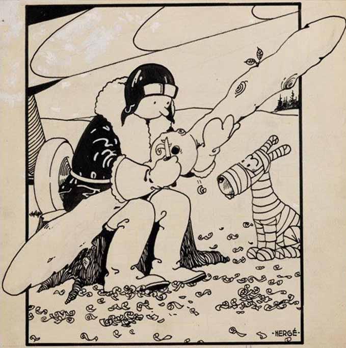 The original cover art is 21 by 26 centimeters. It incorporates Hergé’s unique artistic style and his reflection on the political scope of the time depicting arguably the most popular comic character worldwide. The title character is shown carving a makeshift propeller for his plane from a tree trunk, under the watchful eye of a bandaged-but-attentive Snowy.