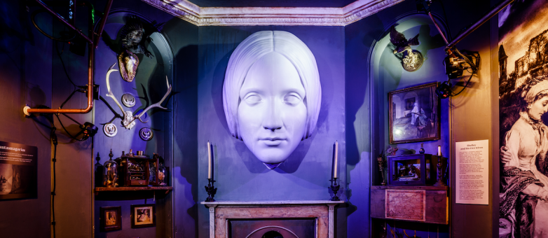 An oversized mask of Mary Shelley on display in Bath, England.