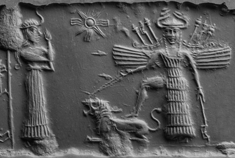 Cylinder seal (modern impression) with goddesses Ninishkun and Ishtar, Mesopotamia, Akkadian, Akkadian period (ca. 2334–2154 BC), Cuneiform inscription: To the deity Niniškun, Ilaknuid, [seal]-cutter, presented (this), Limestone. The Oriental Institute of the University of Chicago, acquired 1947; A27903.