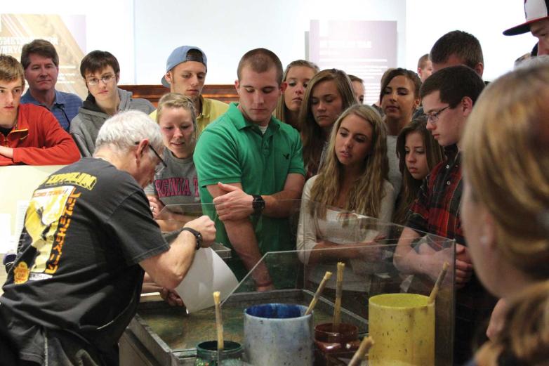 Peter James seen here giving a paper marbling demonstration as part of his work with the Government Printing Office.