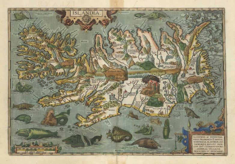 Abraham Ortellius’ map of Iceland was first published in the 1590 expanded edition of his magnificent atlas, Theatrum Orbis Terrarum [Theatre of the World]. Ortellius encircled the island with twelve “denizens of the deep,” many of which were borrowed directly from Magnus.