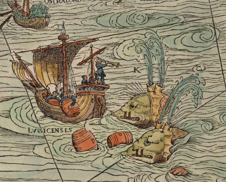According to Magnus, some of the largest whales could raise their awkward bodies beyond the height of a ship’s mast and spew forth a cloud of water that sunk even the strongest ships.