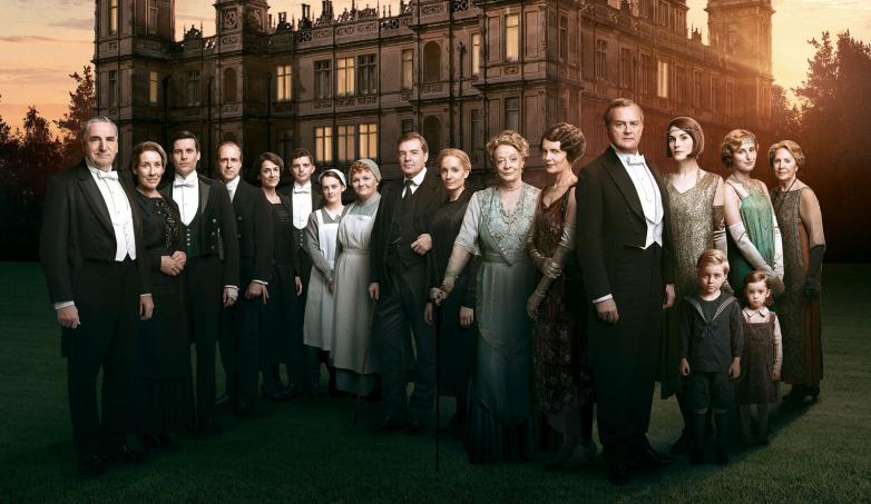 The cast for Downton Abbey’s final season, with Highclere Castle—the real “Downton Abbey”—in the background.