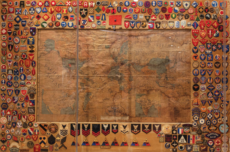 Alongside the eightieth anniversary of D-Day this year, the personal stories behind World War II-era maps are being explored. Like in New Orleans at the National WWII Museum, where there’s a large world map on display in the newly renovated Forbes Rare and Iconic Artifact Gallery. It was used by Maude Stevenson, executive secretary of the Travelers Aid Society at Union Depot in El Paso, Texas. It was pinned in her office, and as she assisted military personnel traveling through the train station, she asked them to sign the map and write their predictions on when the war would end. These ranged from the optimistic (“tomorrow”) to dates projected years into the future. Hundreds signed it, including celebrities like bandleader Kay Kyser and Red Skelton. She framed it with nearly 350 unit patches given to her by those she aided.