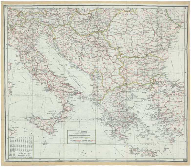 This two-sided escape map made of silk was issued by the Ministry of Defence in the UK in 1943, showing on either side countries in Europe.