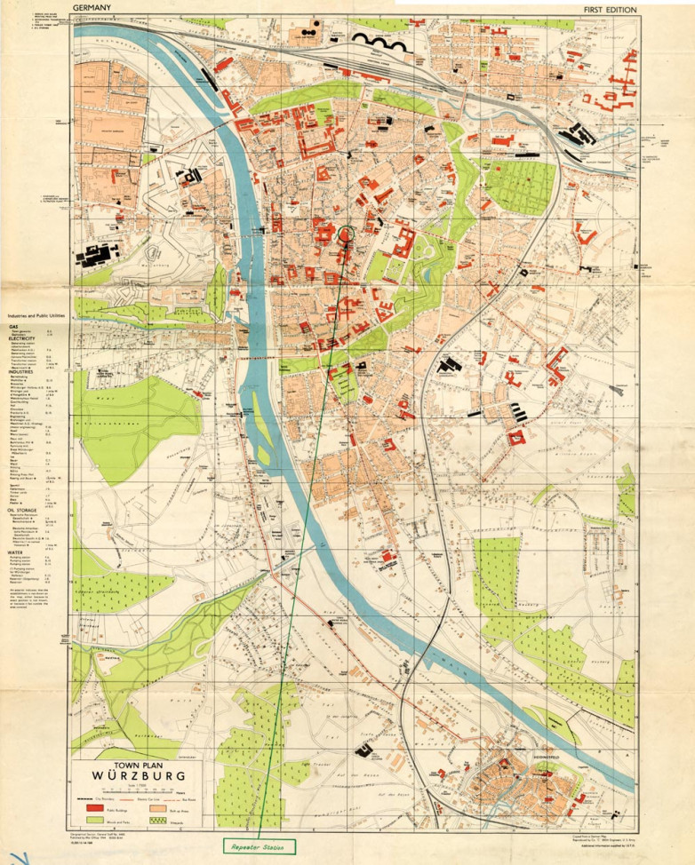 A World War II-era map at the University at Buffalo Libraries showing Würzburg, Germany, has Allied markings representing key military targets.