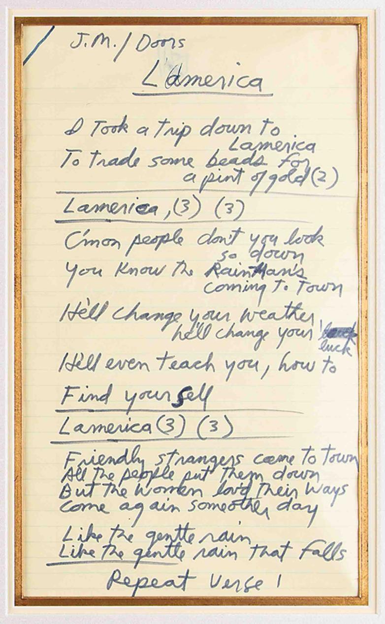 • Jim Morrison's handwritten lyrics for The Doors' song L'America which reveals slight differences from the recorded version