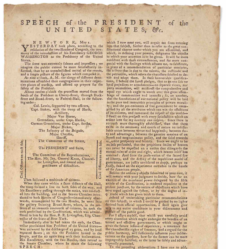 Detail from Printed Broadside of George Washington's inaugural speech  sold for $381,500