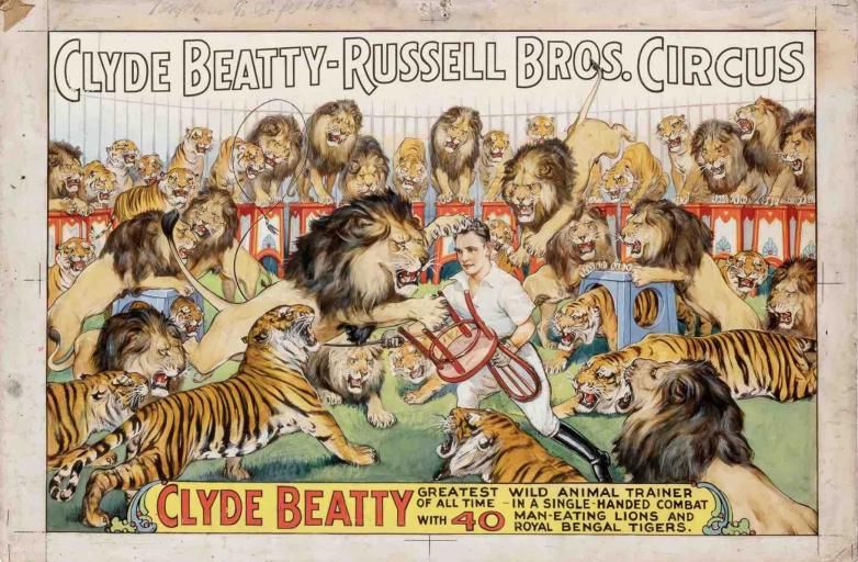 • Cole Bros. Circus Clyde Beatty Greatest Wild Animal Act of All Time. Black-Maned Man-Eating Lions and Siberian Tigers, also estimated at $500-700, made $2,160. It was printed around 1910-1930. This  gouache on two panels on a single board piece featured Clyde Beatty taming numerous big cats