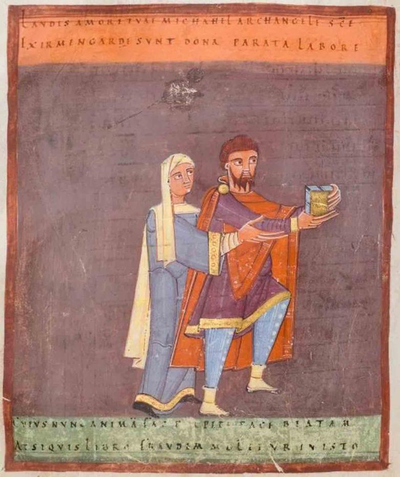 Based on the script, it is thought that the text of the Irmengard Codex was written around 1030-1050. The full-page miniatures were added shortly after 1053 at the order of Irmengard. The illumination program culminates in an extremely rare dedication image in which Irmengard presents her book in memory of her deceased husband Werner and their son Adalbert, who were killed in 1053 at the Battle of Civitate.