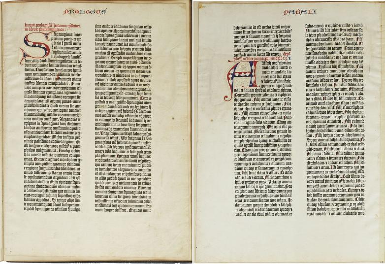 The Bible was printed by Johannes Gutenberg in Mainz, Germany from 1450-1455. There are less than 50 complete or near-complete copies of the Gutenberg Bible extant, with nearly all those housed in public institutions. Singular leaves are also scarce, with the leaf presented here having been acquired by bookseller Gabriel Wells, whose purchase of an incomplete Bible in 1920 gave way to selling the individual leaves alongside an essay by A. Edward Newton entitled ''A Noble Fragment.’’ The leaf is number 193 of the full Latin Bible, with the recto being the Prologue to 1 Chronicles of the Old Testament, and the verso the first part of Chapter 1 of 1 Chronicles. Each page features two columns of 42 lines in dark black Gothic type, accented by red and blue rubrication. Each copy of the Gutenberg Bible differs in its rubrication and illumination, with buyers at the time deciding upon these embellishments after the Bible was printed. The six-line rubricated letters of this leaf were likely added later, restored to match the original style.